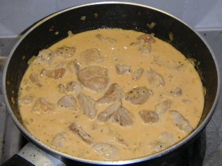 Dann den gehackten Knoblauch dazugeben und kurz weiterbraten. Zwiebel-Knoblauch-Mischung aus der Pfanne nehmen und (eventuell mit etwas neuen Öl), die Geflügelwürfel bei guter Hitze von allen Seiten anbraten, bis sie Farbe angenommen haben. Dabei etwas salzen. Dann die gebratenen Zwiebeln mit dem Knoblauch dazugeben und kurz umrühren. Das ganze mit der Hälfte des Weines ablöschen, die Hitze reduzieren und kurz köcheln lassen. Wenn der Wein sehr trocken ist, jetzt etwa 1/2 Teelöfel Zucker dazugeben. Thymian, Oreganon, Tomatenmark (ca. 1 Eßlöffel) und Pfeffer dazugeben, dann den Rest des Weines und den Parmesan. Gut umrühren. Wenn der Parmesan sich aufgelöst hat, die Sahne unterrühren und noch einmal aufkochen lassen. Mit Salz und Pfeffer abschmecken.