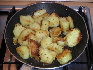 Olivenöl in einer Pfanne erhitzen und Kartoffeln darin bei mittlerer Hitze goldbraun braten. Dabei gelegentlich etwas salzen. Sollte die Pfanne zu klein sein, lieber in mehreren Partien arbeiten, fertige Kartoffen dabei auf einem Teller lagern. Am besten eignet sich übrigens eine beschichtete oder, noch besser, eine Dural-Pfanne.